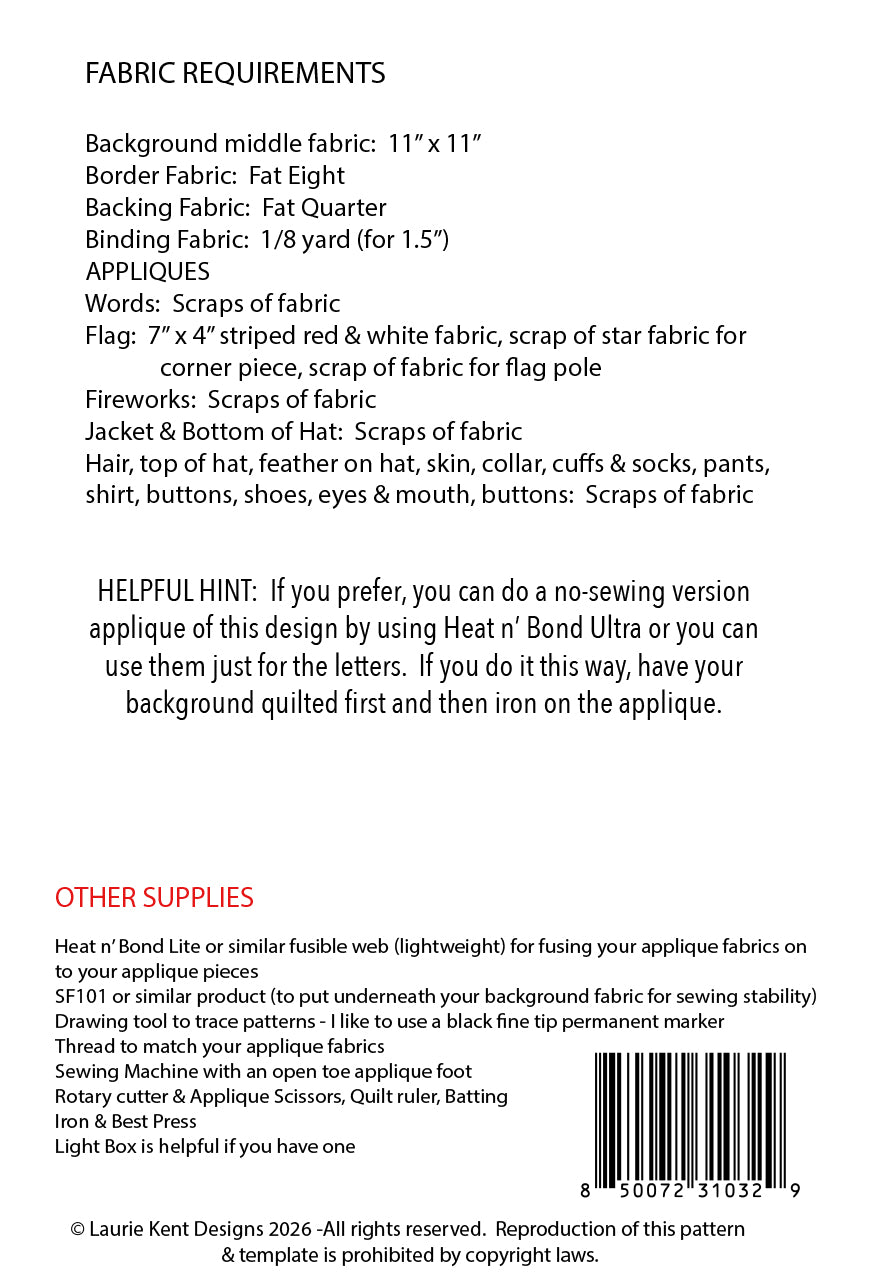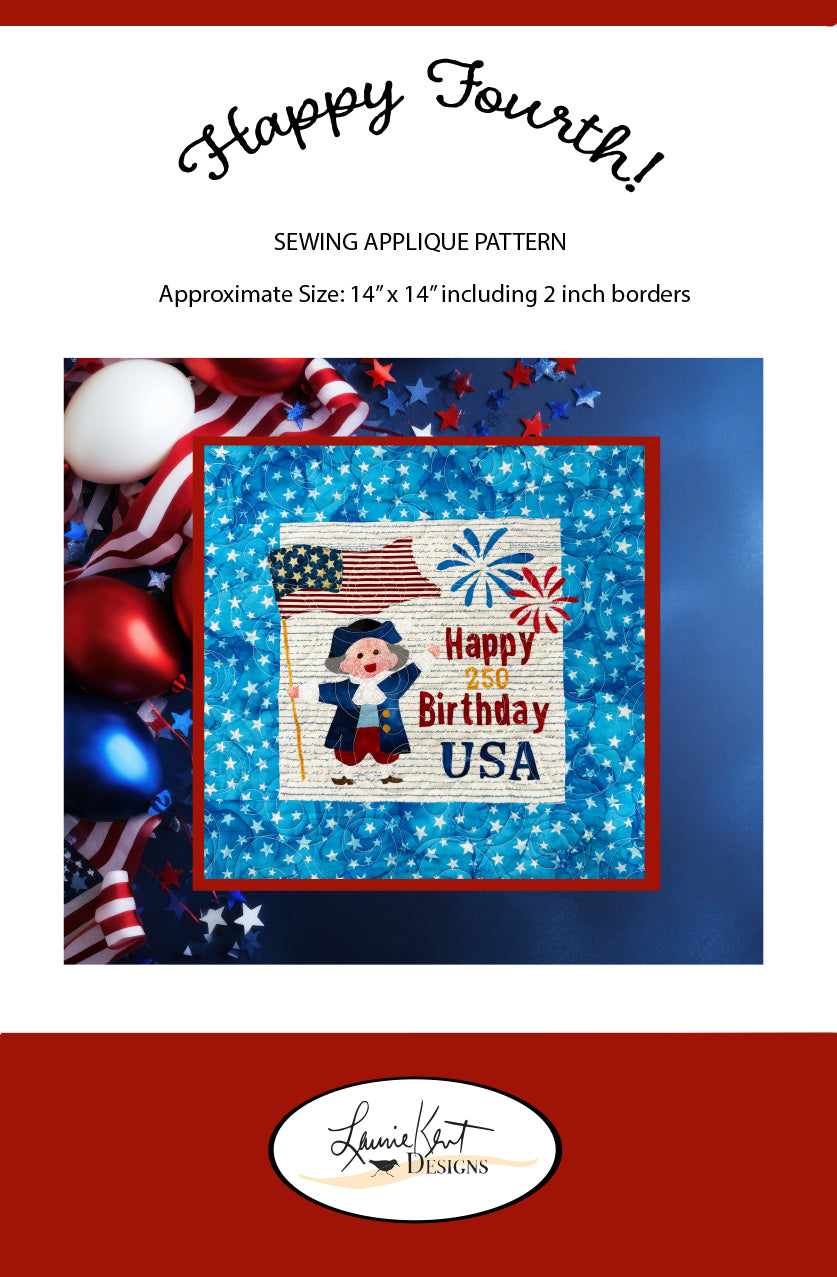 Celebrate freedom, fireworks, and fabric fun with Laurie Kent Designs’ Happy 4th Sewing Appliqué Pattern! This cheerful patriotic mini quilt/wall hanging features a festive colonial-inspired character, bold red, white, and blue fireworks, and a fun celebration message that’s perfect for summer decorating.