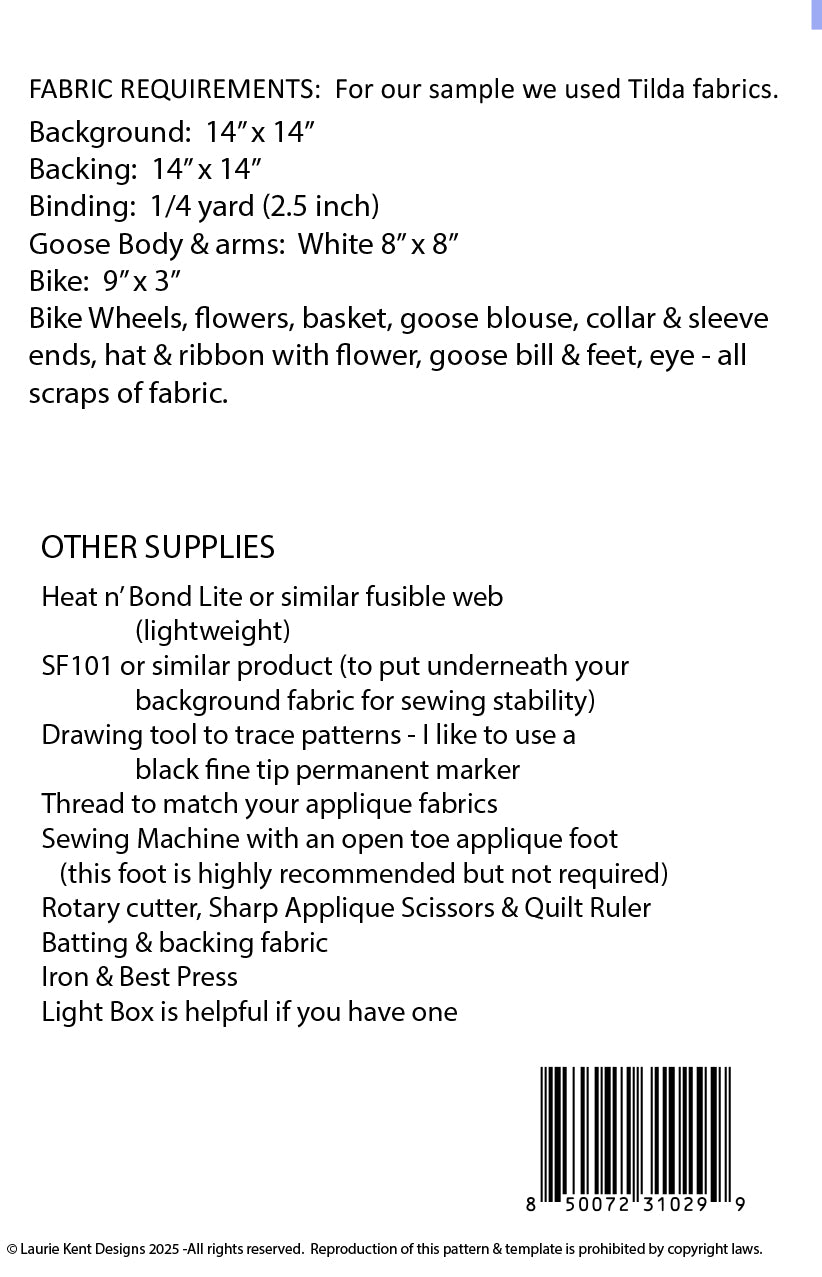 Bring a burst of charm and cheerful color into your sewing room with Flower Market Day, a delightful applique pattern from Laurie Kent Designs. This whimsical 12" x 12" project features an adorable goose pedaling her bicycle through the flower fields—perfect for bright spring fabrics, fun summer florals, and favorite scraps from your stash.