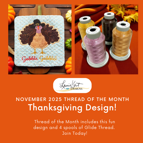 Join in on the fun with our monthly embroidery designs! Enjoy a FREE embroidery design each month, along with FIVE spools of coordinated Hab+Dash Glide thread.