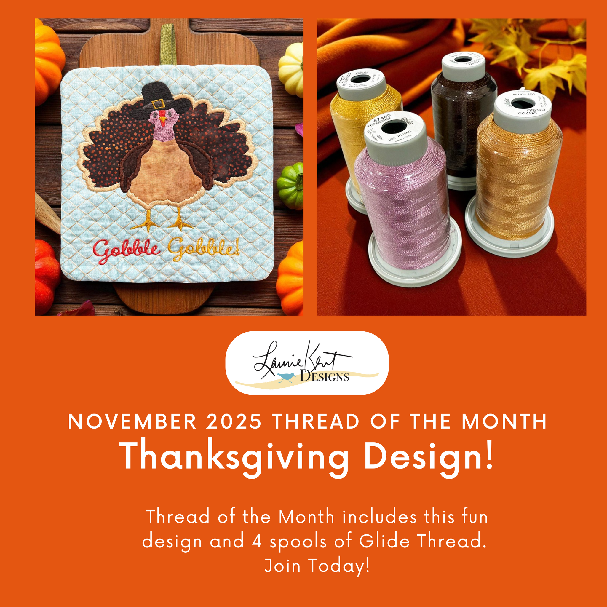 This month's Glide thread colors are: MILITARY GOLD, CHOCOLATE, CALICO & TEABERRY